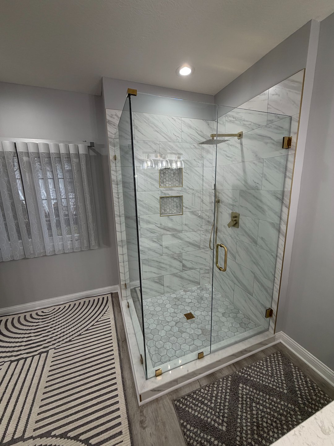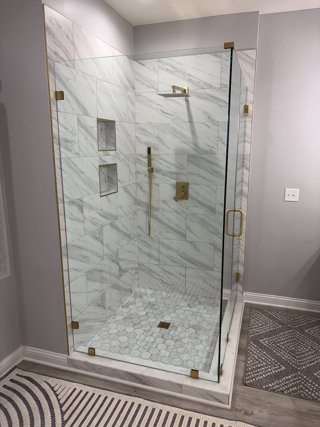 With no header or bulky framing, this installation required careful measurement and precise placement. Frameless glass leaves no room for error — margins must be tight, panels must be level and plumb, and hinge alignment must be exact to ensure smooth door operation and long-term performance. The clean lines of the glass allow the tile work and fixtures to remain fully visible, while the gold accents provide just enough detail to elevate the entire enclosure.